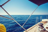 jacht katamaran. Błękitny ocean spokojny i bezchmurne niebo niebieskie są w tle