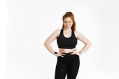 Szczęśliwa młoda kobieta siedzi na podłodze i rozciąganie