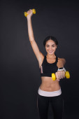 Zdjęcie "Wesoły kobieta z hantlami" może być wykorzystywane do celów osobistych i komercyjnych zgodnie z warunkami zakupionej licencji Royalty-free. Obraz jest dostępny do pobrania w jakości wysokiej rozdzielczości do 5760x3840.