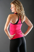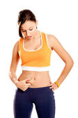 Szczęśliwy fitness kobieta patrząc w jej idealne ciało