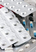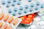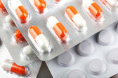 Tabletki o wielu kształtach i kolorach zgrupowane razem