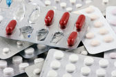 Tabletki o wielu kształtach i kolorach zgrupowane razem