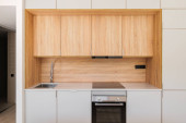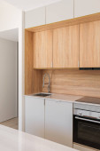 Zdjęcie "Nowoczesne białe i drewniane minimalistyczne wnętrze kuchni, koncepcja domu. nowoczesny piekarnik, kuchenka mikrofalowa" może być wykorzystywane do celów osobistych i komercyjnych zgodnie z warunkami zakupionej licencji Royalty-free. Obraz jest dostępny do pobrania w jakości wysokiej rozdzielczości do 5760x3840.