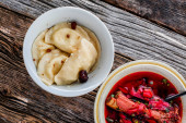 Pyszny talerz zupy wołowej ze świeżym chlebem na drewnianym stole