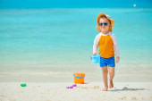 Małe dziecko w duży biały Słomkowy kapelusz zabawy na tropikalny
