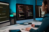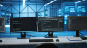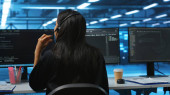 Zdjęcie "Rządowi hakerzy analizują dane w celu wykrycia cyberzagrożeń, patrząc na duży ekran w biurze high-tech. Podkreślić cyberinteligencję, bezpieczeństwo online i zapobieganie zagrożeniom cyfrowym. Kamera A." może być wykorzystywane do celów osobistych i komercyjnych zgodnie z warunkami zakupionej licencji Royalty-free. Obraz jest dostępny do pobrania w jakości wysokiej rozdzielczości do 5760x3840.