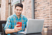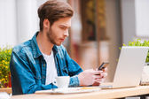 mężczyzna trzyma cyfrowego tabletu w kawiarni chodniku