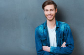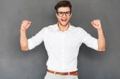 Młody człowiek wesoły, utrzymanie rękoma wzniesionymi