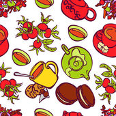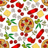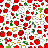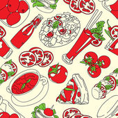 Pomidor. Keczup. Pizzy. Bezszwowe ilustracja wektorowa (tekstura) z obrazem pomidory, sok pomidorowy, pizza, keczup kanapki i kiszona kapusta. Jasny obraz.