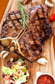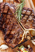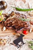 Club Beef stek z sosem pieprzowym i grillowane warzywa na desce do krojenia na ciemnym drewnianym tle