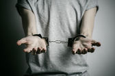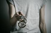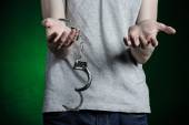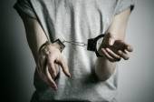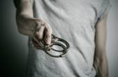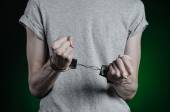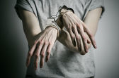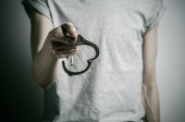 Więzienia i skazana temat: człowiek z kajdankami na rękach w szary T-shirt na szarym tle w studio, umieścić kajdanki na gwałciciela