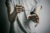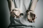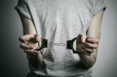 Zdjęcie "Więzienia i skazana temat: człowiek z kajdankami na rękach w szary T-shirt na szarym tle w studio, umieścić kajdanki na gwałciciela" może być wykorzystywane do celów osobistych i komercyjnych zgodnie z warunkami zakupionej licencji Royalty-free. Obraz jest dostępny do pobrania w jakości wysokiej rozdzielczości do 5760x3840.