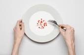Leki i niewłaściwe odżywianie temat: ludzką ręką trzymać talerz z pigułki na białym tle na białe tło widok z góry