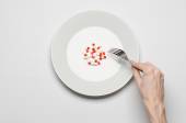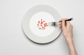 Leki i niewłaściwe odżywianie temat: ludzką ręką trzymać talerz z pigułki na białym tle na białe tło widok z góry