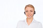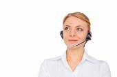 Obsługa telefonu operatora w słuchawki, blondynka,