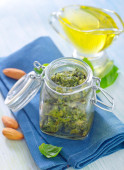 Pesto domowej roboty na rustykalne drewnianą deską do krojenia.