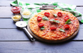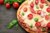 pyszną pizzę z serem i pomidorami koktajlowymi na drewnianym stole, widok z góry