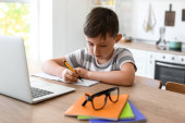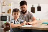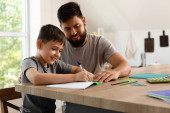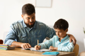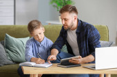 Zdjęcie "Ojciec i jego synek odrabiają lekcje na podłodze z laptopem w domu" może być wykorzystywane do celów osobistych i komercyjnych zgodnie z warunkami zakupionej licencji Royalty-free. Obraz jest dostępny do pobrania w jakości wysokiej rozdzielczości do 5760x3840.