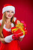 piękna kobieta, ubrana w Boże Narodzenie trzyma kieliszek z szampanem