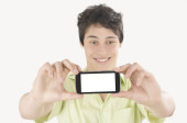 szczęśliwy biznesmen robienie zdjęć selfie z jego silny telefon.