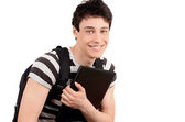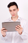 szczęśliwy biznesmen robienie zdjęć selfie z jego silny telefon.
