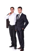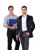 dwóch mężczyzn biznesowych posiadających umowy folderu na białym tle