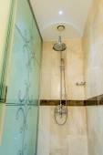 Jasnych i białych łazienka z wanną, biały, beżowy płytki podłogowe, szklane drzwi prysznic
