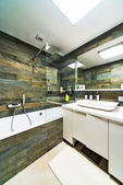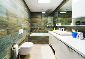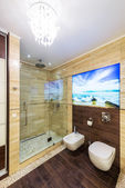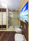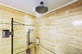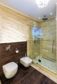 Zdjęcie "Jasnych i białych łazienka z wanną, biały, beżowy płytki podłogowe, szklane drzwi prysznic" może być wykorzystywane do celów osobistych i komercyjnych zgodnie z warunkami zakupionej licencji Royalty-free. Obraz jest dostępny do pobrania w jakości wysokiej rozdzielczości do 5760x3840.
