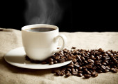 Filiżanka do kawy ze spodkiem z worka z ziaren kawy na białym