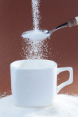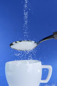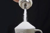 ręka człowieka z łyżką wylewanie szalone dużo w pełni kawy cup w koncepcję uzależnienia