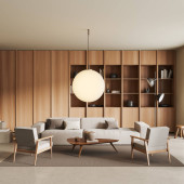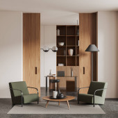 Drewniany domowy salon z sofą i fotelami, stolik kawowy z dekoracją na dywanie, betonowa podłoga. Strefa Lounge z minimalistycznymi meblami. Renderowanie 3D