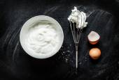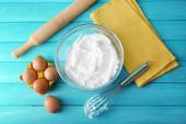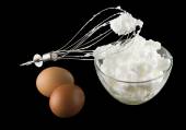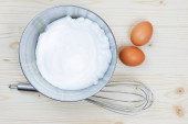 Whipped egg whites for cream in a glass bowl, whisk and wooden s