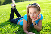Zdjęcie "piękna blondynka leży na trawie w parku na wiosnę" może być wykorzystywane do celów osobistych i komercyjnych zgodnie z warunkami zakupionej licencji Royalty-free. Obraz jest dostępny do pobrania w jakości wysokiej rozdzielczości do 5760x3840.