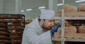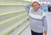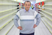 znudzony sprzedawca w sklepie z puste półki i liczniki