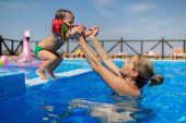 piękna kobieta przyłapuje małą dziewczynkę skaczącą do basenu przeciwko morzu