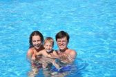 Szczęśliwa rodzina z małą dziewczynką kąpać się w basenie, córka siedzi w pobliżu