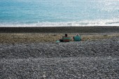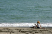 rodzice z dzieckiem stoją na wybrzeże, widok z tyłu