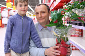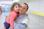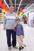 starszy człowiek w pustych półek w sklepie z dzieckiem na rękach