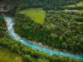 Turkusowe rzeki wije się przez zalesiony krajobraz