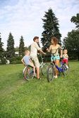 matka z synem i córką jeździć na rowerach poza miastem