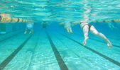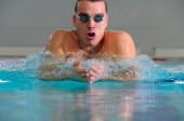 młody człowiek w wodnych gogle pływanie w basenie, rozszerzone ręce