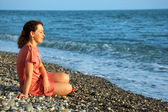 młoda kobieta miejsc w wodzie na plaży przy zachodzie słońca