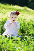 dziewczynka siedzi na trawie w parku