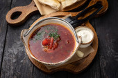 Zdjęcie "Smaczna zupa lub gulasz z wołowiny i przypraw. Pikantna i aromatyczna zupa orzechowa przyprawiona pieprzem i podawana z chlebem." może być wykorzystywane do celów osobistych i komercyjnych zgodnie z warunkami zakupionej licencji Royalty-free. Obraz jest dostępny do pobrania w jakości wysokiej rozdzielczości do 5760x3840.