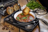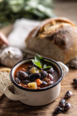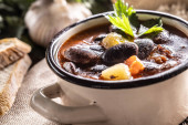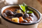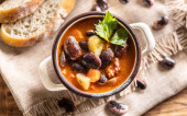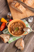 Smaczna zupa lub gulasz z wołowiny i przypraw. Pikantna i aromatyczna zupa orzechowa przyprawiona pieprzem i podawana z chlebem.