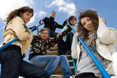 Grupa przyjaciół w białym t spodenki mają odpoczynku na trawie