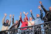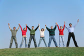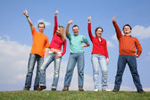 Grupa przyjaciół w białym t spodenki mają machał do góry