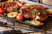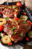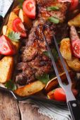 Wieprzowina zbliżenie ziemniaki na patelni grill. pionowe widok z góry