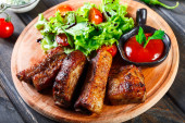 Zdjęcie "Żeberka z grilla, ziemniaki i pomidory na zbliżenie płyta. widok z góry" może być wykorzystywane do celów osobistych i komercyjnych zgodnie z warunkami zakupionej licencji Royalty-free. Obraz jest dostępny do pobrania w jakości wysokiej rozdzielczości do 5760x3840.