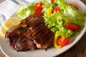 Żeberka wieprzowe, zbliżenie ziemniaki na patelni grill. pionowe widok z góry